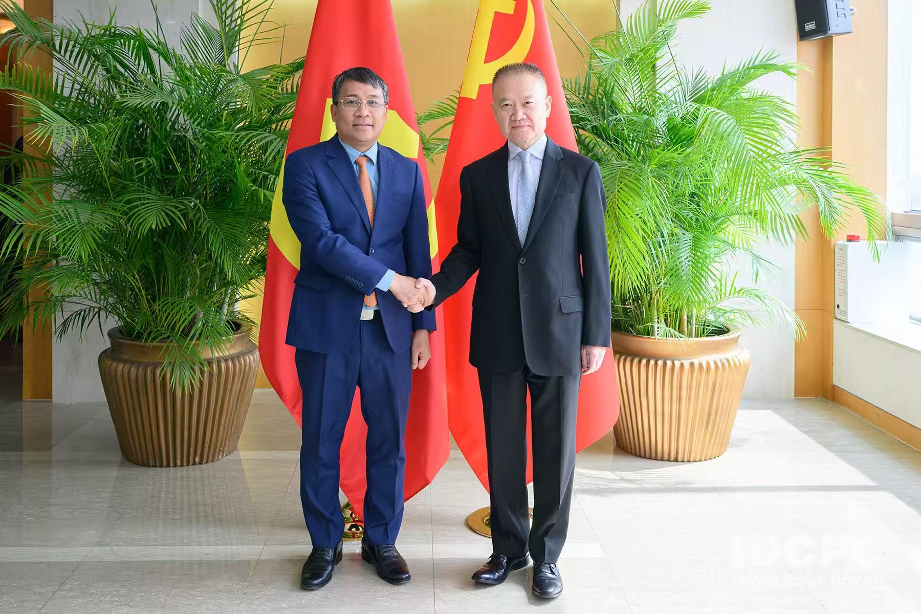 Trưởng Ban Liên lạc đối ngoại Trung ương Đảng Cộng sản Trung Quốc Lưu Hải Tinh hội kiến Thứ trưởng Thường trực Bộ Ngoại giao Việt Nam Nguyễn Minh Vũ