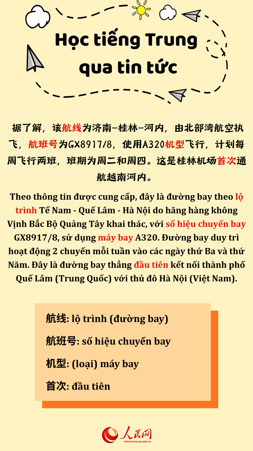 Theo thông tin được cung cấp, đây là đường bay theo lộ trình Tế Nam - Quế Lâm - Hà Nội do hãng hàng không Vịnh Bắc Bộ Quảng Tây khai thác, với số hiệu chuyến bay GX8917/8, sử dụng máy bay A320. Đường bay duy trì hoạt động 2 chuyến mỗi tuần vào các ngày thứ Ba và thứ Năm. Đây là đường bay thẳng đầu tiên kết nối thành phố Quế Lâm (Trung Quốc) với thủ đô Hà Nội (Việt Nam).