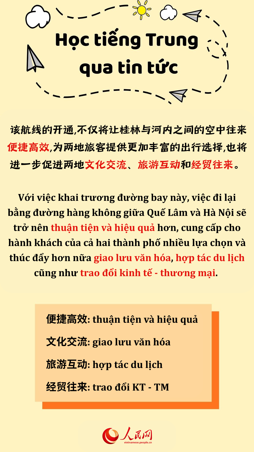 Với việc khai trương đường bay này, việc đi lại bằng đường hàng không giữa Quế Lâm và Hà Nội sẽ trở nên thuận tiện và hiệu quả hơn, cung cấp cho hành khách của cả hai thành phố nhiều lựa chọn và thúc đẩy hơn nữa giao lưu văn hóa, hợp tác du lịch cũng như trao đổi kinh tế - thương mại.