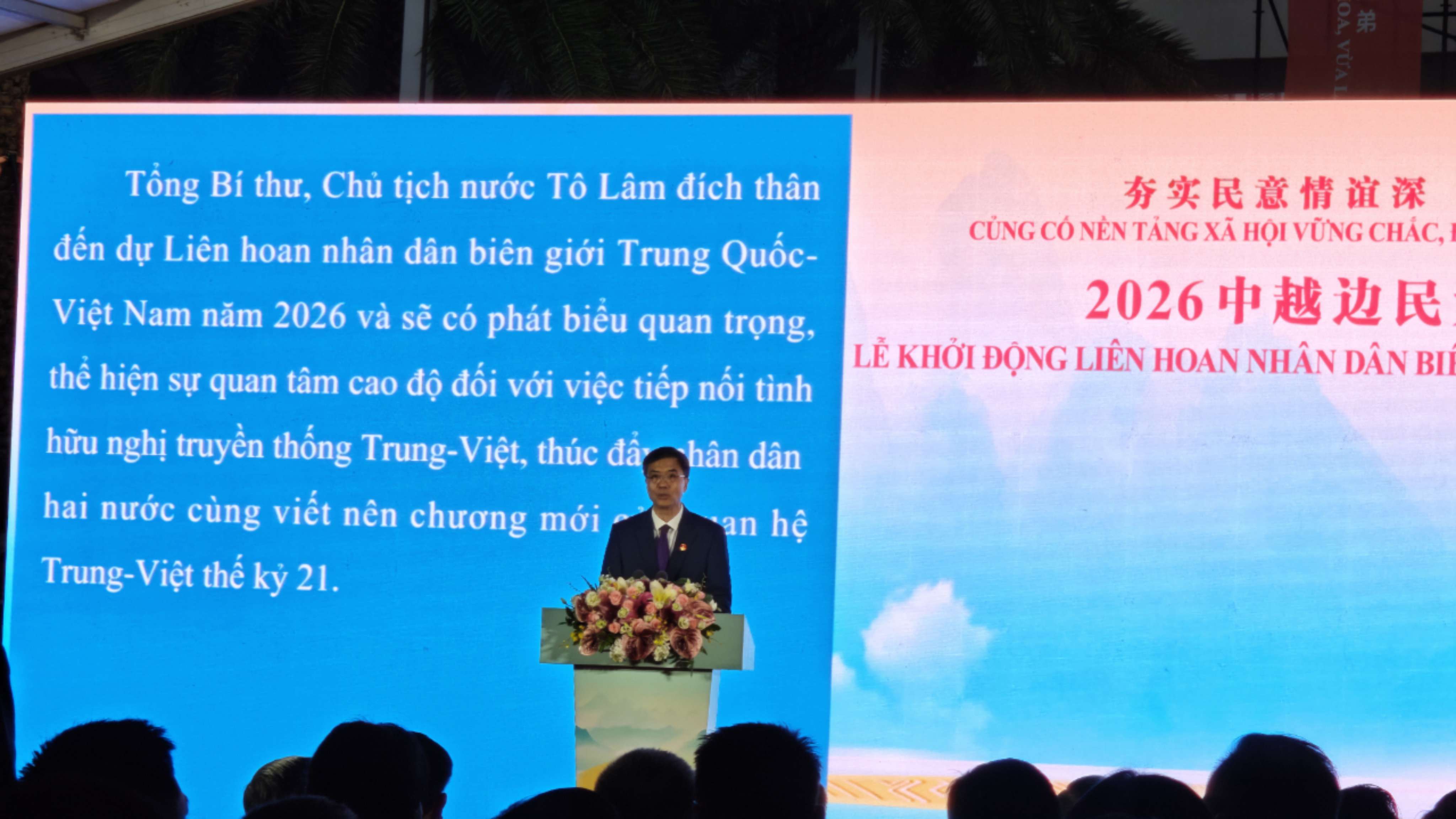 Ngày 17/4, Lễ khởi động Liên hoan Nhân dân Biên giới Trung – Việt 2026 đã diễn ra tại Trung tâm Hợp tác Ứng dụng Trí tuệ Nhân tạo Trung Quốc - ASEAN, thành phố Nam Ninh, Quảng Tây, Trung Quốc. Tổng Bí thư, Chủ tịch nước Vịêt Nam Tô Lâm, Bí thư Đảng ủy Khu tự trị dân tộc Choang Quảng Tây Trần Cương, Phó Chủ tịch Hội hữu nghị đối ngoại nhân dân Trung Quốc Viên Mẫn Đạo cùng hơn 500 đại biểu thanh niên hai nước Việt - Trung đã tham dự cùng nhau vun đắp tình hữu nghị.